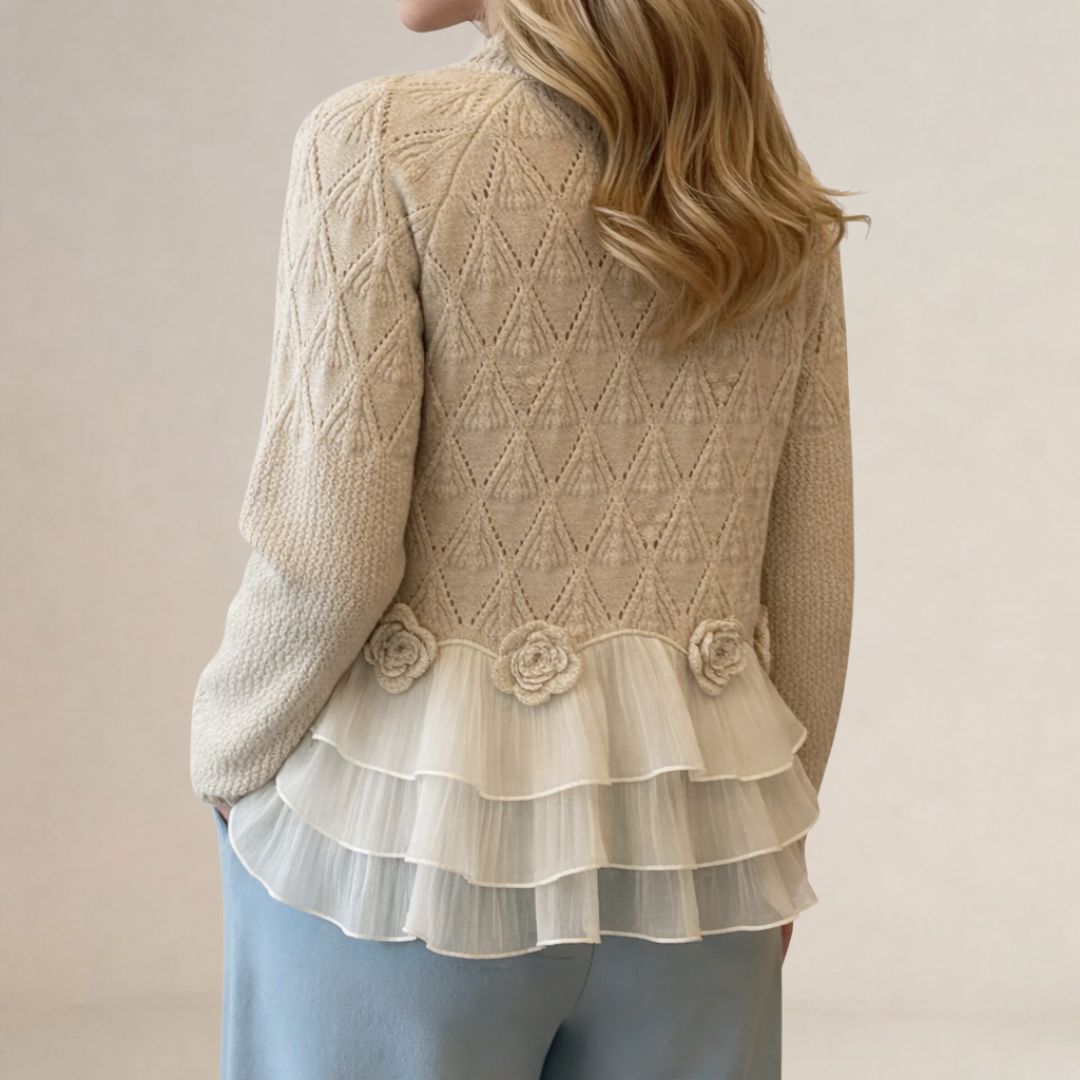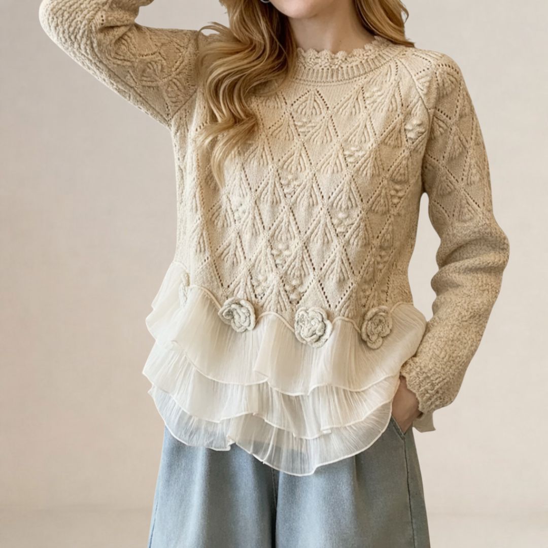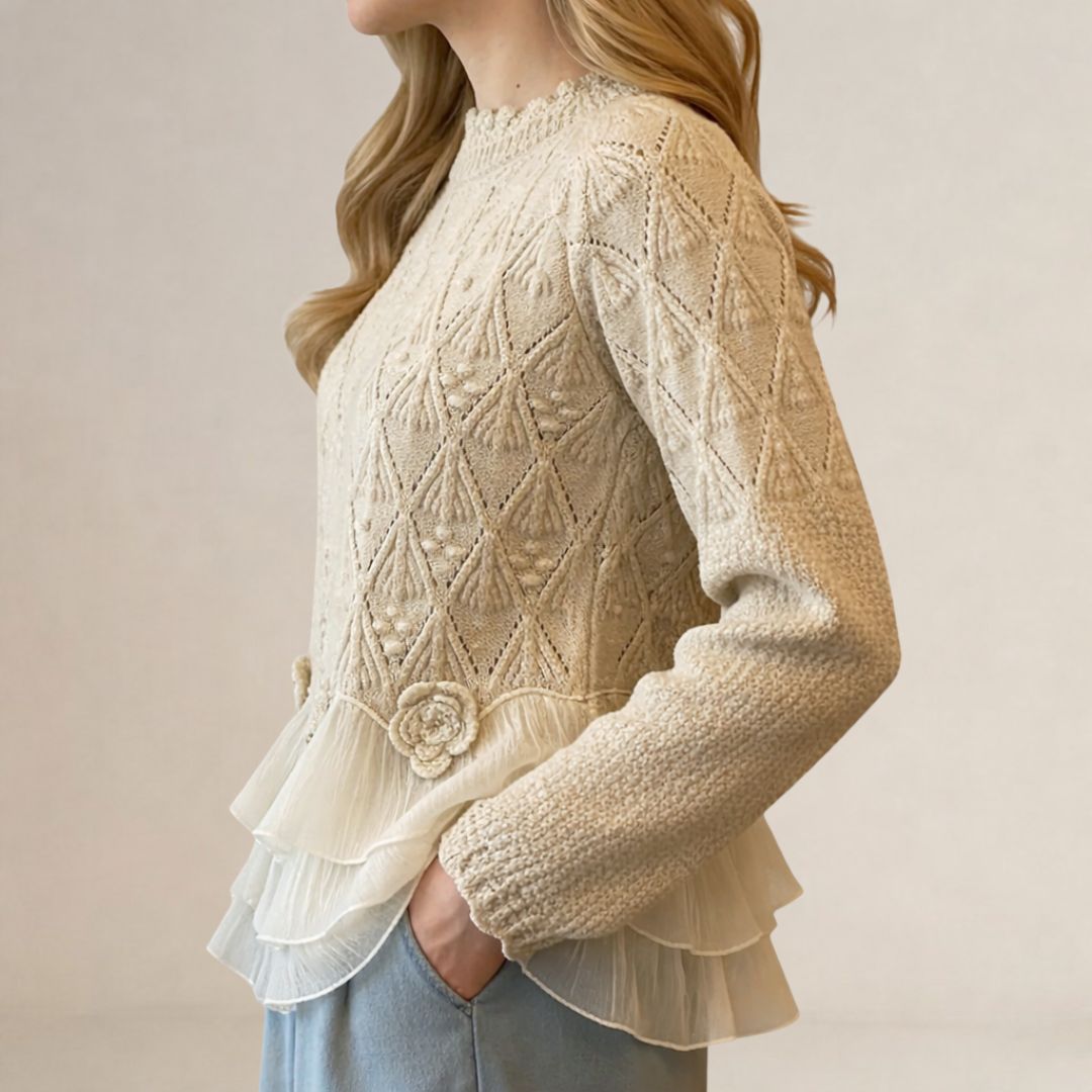 Intricate knitting patterns and soft, layered details immediately catch the eye and give this pullover a refined, craft-inspired expression. Made from a comfortable knit fabric with a slightly relaxed fit, it balances structure and softness through its textured surface and flowing edge. The look is romantic and elegant, exuding discreet beauty in every movement. Easy to style with both pants and wide skirts – perfect for both casual days and stylish, thoughtful outfits.