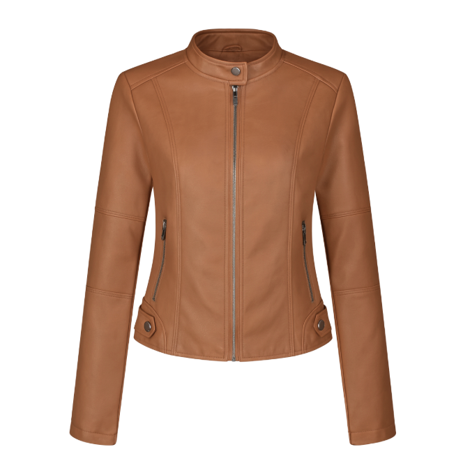Embark on a stylish journey with Savannah, the epitome of elegance in leather jackets! This jacket, crafted from luxurious and soft vegan leather, embodies elegance and high-quality craftsmanship. The smooth material ensures comfort while exuding sophistication. Savannah features multiple pockets with metal zippers and is practical without compromising on style. It is perfect for any occasion, whether it's a casual day out or a special event.